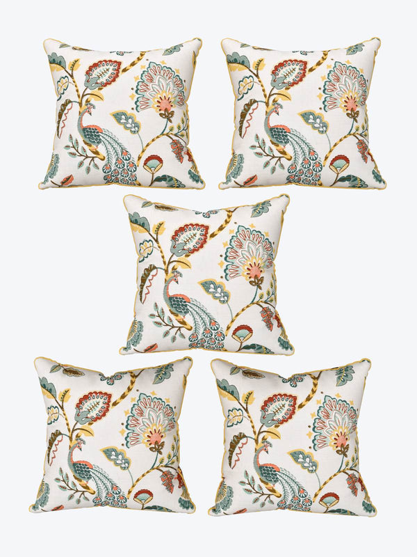 Cream Set of 5 Floral Patterned Cotton Square Reversible Cushion Covers